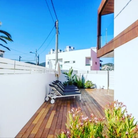 Modern luxury 5 bedroom detached house with tourist license. Located in Illa plana, 1 minute’s walk from Talamanca beach and 200 meters from Marina Botafoch with sea views of Talamanca bay. 5 double rooms each with en suite bathrooms. Fully equipped – Wifi / SmartTV’s / Central heating / central AC / designer kitchen with new Bosch appliances throughout – fridge freezer / oven / dishwasher / washing machine and dryer. Ample garden space with outdoor dining for 12 and a jacuzzi for 6 with an outdoor shower unit. * Swimmingpool will be bild this winter. Summer 2020 will have a Swimmingpool With the beach next door and sea views…. Private parking for 4 vehicles. Central concierge linked Alarm system + safety box.